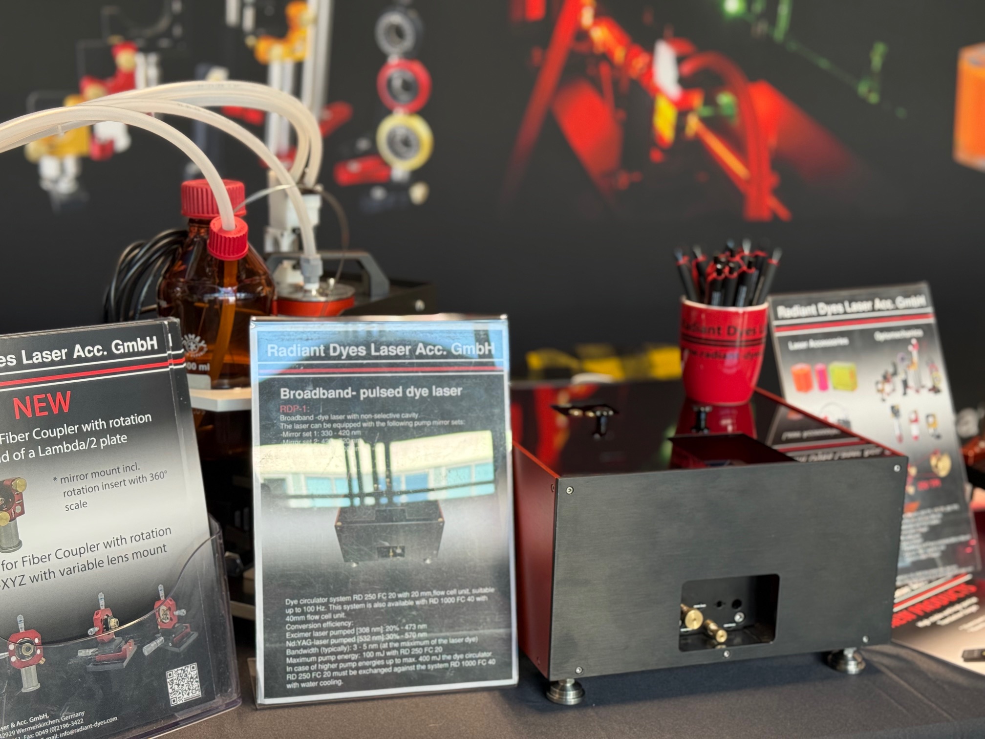 Radiant Dyes has 30 years of experience in Laser Dyes and Dye Laser development. We are the oldest existing manufacturer of tunable laser and laser accessories. "Radiant Dyes Laser Acc. GmbH" is a synonym for high quality products: dye lasers. Our dye laser "NarrowScan" has been developed further over the last years and is now the most advanced product of Radiant Dyes. Similarly Radiant Dyes kept the cw-ring and Titan-Sapphire lasers up to date. For more than 20 years, we also offer successfully, excimer lasers. Since 2009 we are selling a tunable narrowband Diode Laser with interference-filter stabilization and external cavity, our "NarrowDiode", and now also available with amplifier. With optomechanical components, such as mirror mounts, lens mounts and posts Radiant Dyes wanted to add a second string to our bow and we have developed them to absolute high-end products. We also offer a variety of laser accessories such as laser dyes, filters, dye cells, optics, dye circulators, cooling aggregates, thyratrons etc for our own laser systems and also for old Lambda Physics, Coherent, Quantel, Quanta Ray lasers and much more. Radiant Dyes gladly offers general overhauls of old laser systems (dye lers and excimer lasers), as well as laser service and training. We participate in the preparation of experiments an the equipment of laboratories, which is highly appreciated by universities and research centres worldwide. For 30 years, Radiant Dyes satisfy individual wishes to the point of series manufacturing. We are the first address for Dye Laser, Laser Accessories and Optomechanics.