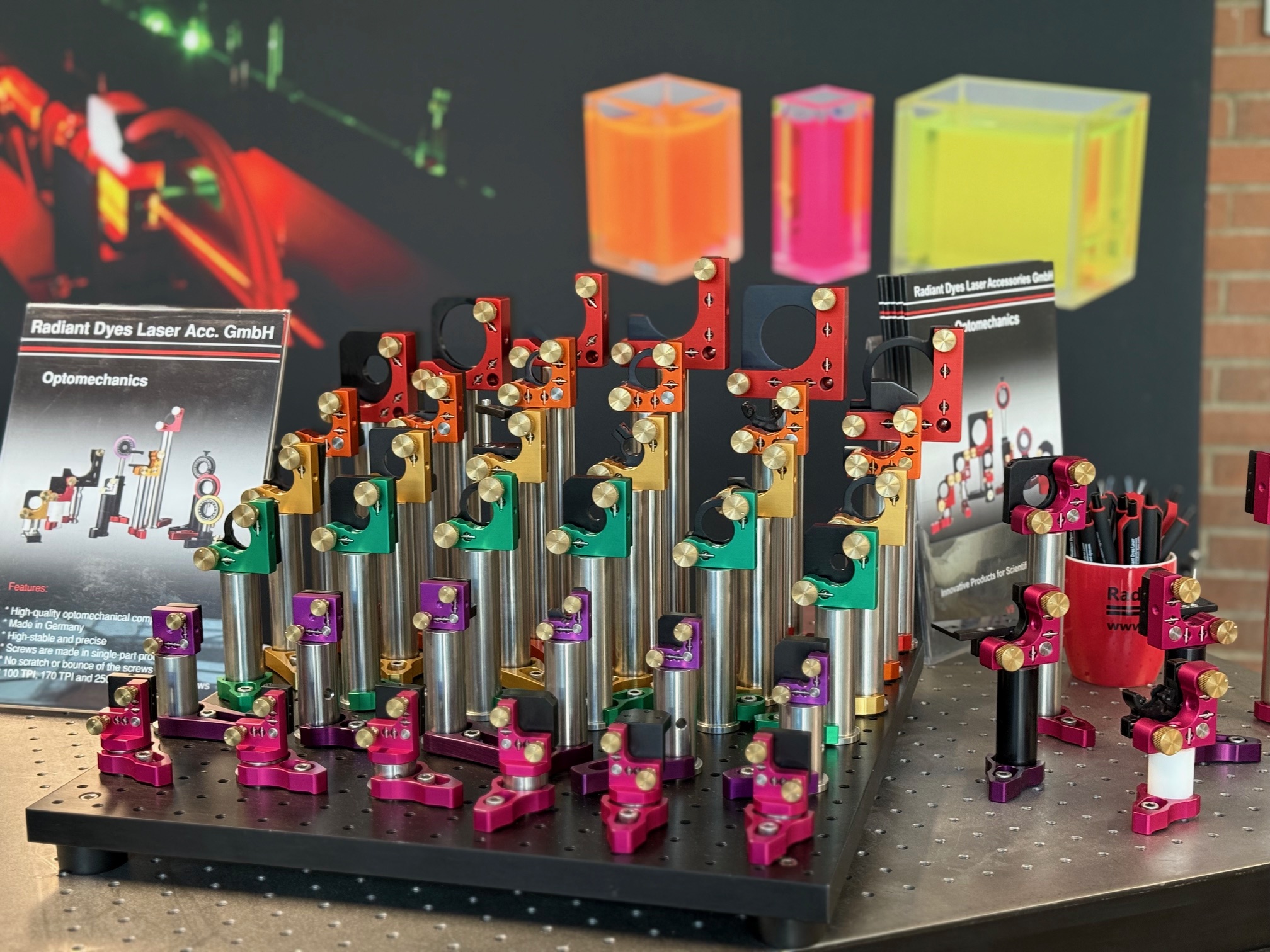 Radiant Dyes has 30 years of experience in Laser Dyes and Dye Laser development. We are the oldest existing manufacturer of tunable laser and laser accessories. "Radiant Dyes Laser Acc. GmbH" is a synonym for high quality products: dye lasers. Our dye laser "NarrowScan" has been developed further over the last years and is now the most advanced product of Radiant Dyes. Similarly Radiant Dyes kept the cw-ring and Titan-Sapphire lasers up to date. For more than 20 years, we also offer successfully, excimer lasers. Since 2009 we are selling a tunable narrowband Diode Laser with interference-filter stabilization and external cavity, our "NarrowDiode", and now also available with amplifier. With optomechanical components, such as mirror mounts, lens mounts and posts Radiant Dyes wanted to add a second string to our bow and we have developed them to absolute high-end products. We also offer a variety of laser accessories such as laser dyes, filters, dye cells, optics, dye circulators, cooling aggregates, thyratrons etc for our own laser systems and also for old Lambda Physics, Coherent, Quantel, Quanta Ray lasers and much more. Radiant Dyes gladly offers general overhauls of old laser systems (dye lers and excimer lasers), as well as laser service and training. We participate in the preparation of experiments an the equipment of laboratories, which is highly appreciated by universities and research centres worldwide. For 30 years, Radiant Dyes satisfy individual wishes to the point of series manufacturing. We are the first address for Dye Laser, Laser Accessories and Optomechanics.